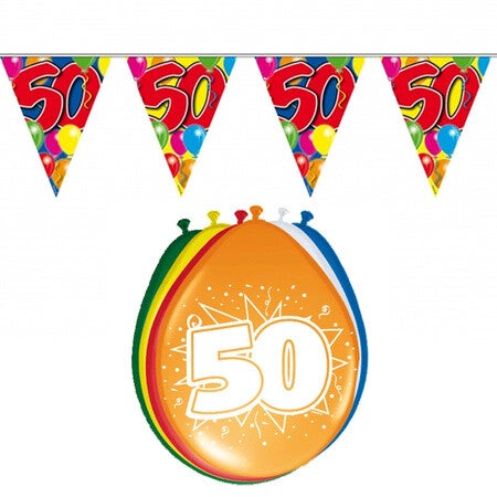 Verjaardag feest 50 jaar geworden versieringen basic pakket bestaande uit ballonnen en feest vlaggetjes. In deze feest decoraties set: 2x gekleurde 50 jarige vlaggenlijnen van plastic van 10 meter en 32x stuks gekleurde feest/party ballonnen met 50 jaar print van 29 cm. Leeftijd feestartikelen en versieringen om de hele kamer of kantoor mee te versieren.