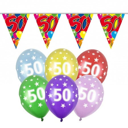 Verjaardag feest 50 jaar geworden versieringen basic pakket bestaande uit ballonnen en feest vlaggetjes. In deze feest decoraties set: 2x gekleurde 50 jarige vlaggenlijnen van plastic van 10 meter en 24x stuks gekleurde feest/party ballonnen met 50 jaar print van 29 cm. Leeftijd feestartikelen en versieringen om de hele kamer of kantoor mee te versieren.