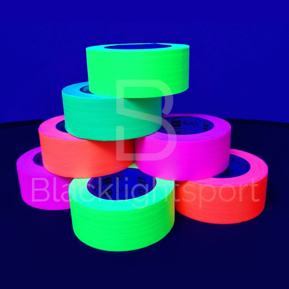 Om alle lijnen van een blacklight zaalvoetbal veld te beplakken heeft u 211 meter tape nodig. U heeft de keuze uit brede tape of smalle tape en 4 verschillende kleuren (geel, oranje, groen, roze).
